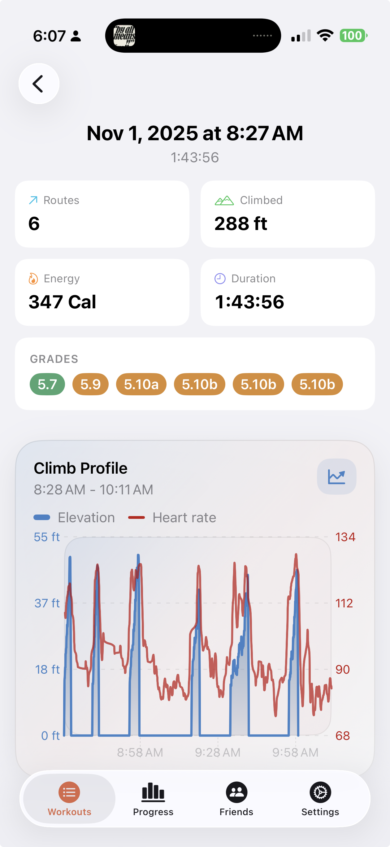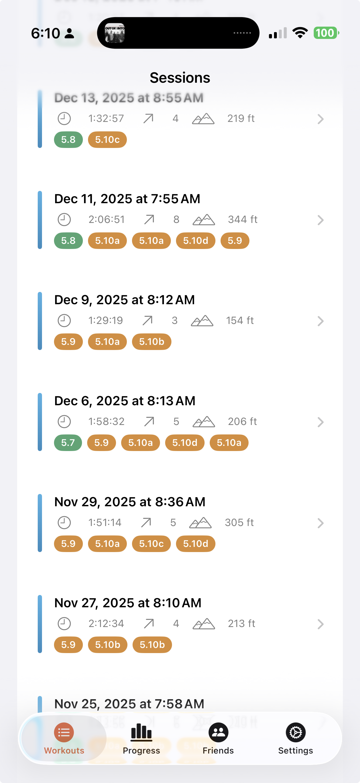 Every climb contributes to a clear session log with route count, total vertical, duration, energy burned, and grades climbed.